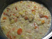 Boiled and slightly mashed potatoes.Today's recipe was last night's dinner - clam chowder. These nights of hard temp freezes begs for comfort food. I used white potatoes, onions and carrots from our fields. And as you know, I cook by feel or taste so all amounts are up to you depending on how much you want to make and your tastes.
