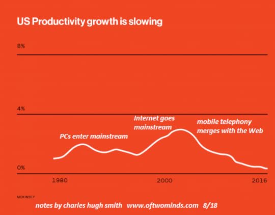 As the accompanying chart shows, productivity in the U.S. has been declining since the early 2000s. This trend mystifies economists, as the tremendous investments in software, robotics, networks and mobile computing would be expected to boost productivity, as these tools enable every individual who knows how to use them to produce more value.