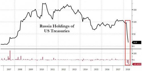As we detailed here first, during the months of April and May, as the Yuan-denominated oil futures were launched, trade war threats escalated, and sanctions were unleashed, Russia liquidated almost 90% of its US Treasury holdings.