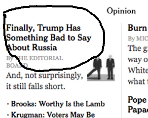 The amateur psychologist in me suspects that the more the USA heaps Russia with censorious opprobrium and punishments, the closer this floundering polity actually is to completely losing its shit. Friday morning’s front-page headline in The New York Times appears to have been written by Pee Wee Herman: