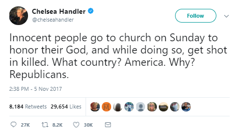 Of course, the tears were still wet on people’s cheeks when the anti-gun folks began screaming for gun control. Chelsea Handler, struggling to be relevant, made this ignorant Tweet: