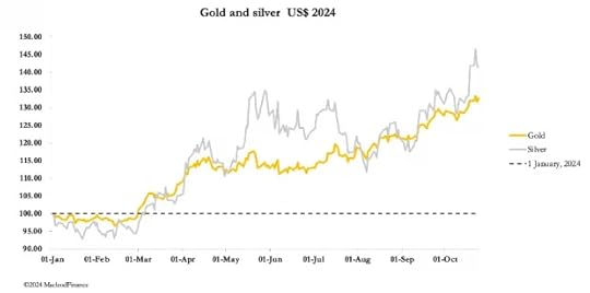 This week, against a background of the BRICS summit in Kazan gold and silver paused, consolidating their recent heady runs. In European trade this morning, spot gold was $2720, unchanged from last Friday’s close, and silver was $33.25, down 40 cents on the same timeframe. Comex volumes were healthy, consistent with bull market turnover.