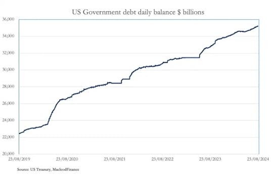 According to the US Government, its debt stands at $35.210 trillion having grown 57% in the last five years. As the chart below shows, there was a big step up in early 2020 due to Covid. But subsequent attempts to control the deficit and therefore indebtedness have been absent.