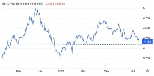 Undoubtedly, market values everywhere are predicated on the Fed cutting rates. To a limited extent, this could become a self-fulfilling prophecy. So far, the effect on the 10-year US Treasury Note, which sets the valuation tone for all financial assets, has been to reduce its yield in recent months from 4.7% to under 4.2% currently. I have pencilled in a potential support line at 4.08% (the pecked line).