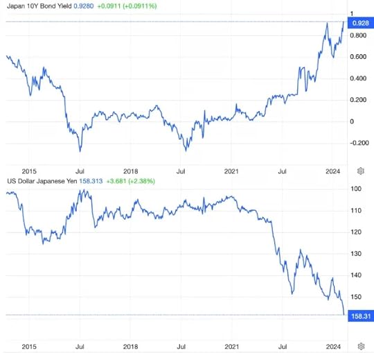 This week, the rise in JGB yields and the decline of the yen accelerated (note: the JPY chart is on an inverted scale). There is no doubt that there is a crisis developing.