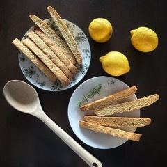 One of my favorite snacks are lemon-thyme biscotti, which I am sharing the recipe with you. They represent my childhood: running barefoot through the woods and the sandy beaches of the French Riviera.