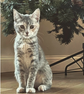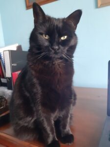 Her favorite thing to do is cuddle, but she also loves staring out the window at birds and imagining that she’s a ferocious huntress stalking prey in the Serengeti.