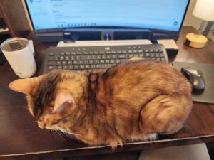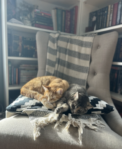 Fable, who is my very orange but scary-intelligent cuddler who just wants to be loved (and get into mischief), and his littermate Rune, my little gray girl who likes a bit of space but is often overwhelmed with adoration for me (and only me, ha).