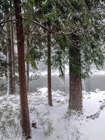 Across the river is a high bank covered in evergreens. The tops of the trees on the top of the hill go almost to the top of my window. Through the trees in the foreground, which are in my yard, all the way through to the trees on the hill, there are bits and pieces of sky.