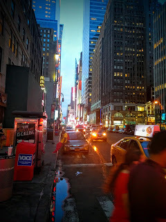Only to find 42nd blocked off ... and 41st ... and... Protests over the recent police shootings are taking place near Times Square. People and police cars block the streets. The air flashes red from emergency vehicles and a helicopter circles overhead.