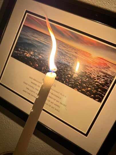 Then back to present day, reading in the glow of a computer screen. He is clothed in light, wrapped in it… James 1:17 reiterates He is the Father of lights, with whom there is no variableness, neither shadow of turning. Just like Elena’s flickering Hanukkah candle.
