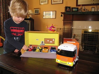 Again, using the annual as a guide, I left the parking spaces white and drew on the lines in black felt-tip as well as drawing on the detail of the back wall. And from then on, we were in the home straight as it were, thanks to being sent to some stickers by a very nice man at Chapman who'd seen my review of the Roary Live! stage show and - in reverse of the normal PR trend - sent me a bundle of goodies as a 'thank you'. In fact, one of them - the new Roary Winter Breeze DVD - we already had, so I'm giving it away as a bonus for a blog reader. But you have to pledge to make a Roary garage like ours and post the pics on your own blog (if you have one). If you don't, you can send them to me and I'll post them here. It's well worth it (and not just for being in with a chance of winning the DVD) and if I can do it, anyone can. Did I ever tell you my philosophy of DIY? It's this - if you can't fix it with a hammer, call an expert!