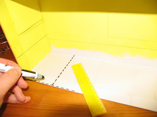 Anyway, to begin at the beginning as someone once said, you'll need to cut down the corners of the shoe-box lid first to make the garage apron, thus: