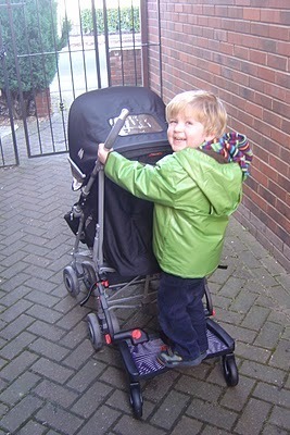 ...which, as you can see, makes Charlie happy. The large wheels and above-ground clearance also makes mummy happy as it means you don't catch your feet on the board as you walk along. With Eloise horizontal in the pushchair, the buggy board actually sticks out further than it might, so this little feature is an ankle-saver...