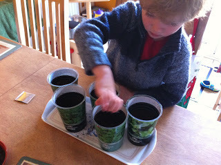 And not content with that, Charlie persuaded me to buy a little windowsill herb garden the other day. (I wasn't kidding about not having a garden, you know.) It can go with all the other things he's growing, like random beans and a sunflower. Because growing things has been the theme at nursery just recently. Well, farming actually. We're doing it on a micro scale, that's all. Boutique farming, that's what it is.