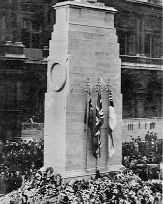 Even before the war ended work was being done on how it would be remembered. Sir Edwin Lutyens had been to France with the newly-founded Imperial War Graves Commission as early as 1917. There, on the old battlefields, he found 'wild flowers that are as friendly to an unexploded shell as they are to the leg of a garden seat in Surrey.' He wrote to his wife of 'the ribbon of isolated graves like a milky way across miles of country where men are tucked in where they fell. Ribbons of little crosses each touching each other across a cemetery, set in a wilderness of annuals and where one sort of flower is grown the effect if charming, easy and oh so pathetic. One things for a moment that no other monument is needed.' But it was. And Lutyens knew it. Once the war was over, the nation knew that Lutyens was the man to provide it.