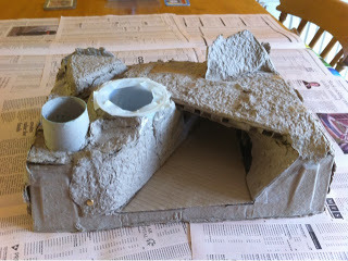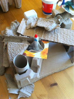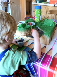 This stuff is great - as you'll see - because it's like ready-made paper mâché without all that flour-and-water mess. I hate mess. Which is why I also opted to spray-paint the main part of the model so as to avoid the paint flakes we'd have had all over the carpet if I'd let Charlie do it with his poster paints.