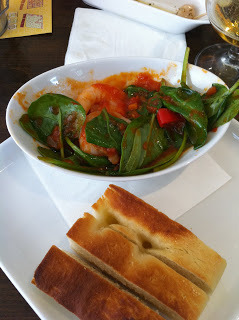 Menus were delivered - including a neat little fold-up one for Charlie which doubles as a colouring book. Drinks were ordered; choices were made. And they weren't easy ones. The menu is varied and extensive. There are all the Italian favourites including pizzas of various provenances, a full range of pasta dishes as well as grills. To start, Sarah chose the grilled goats cheese with plum tomatoes and caramelised onions. I plumped for the tiger prawns with garlic, chilli and spinach.