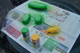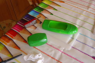 A shampoo bottle, one of those little Sodastream sample sachets, and the plastic box that Eloise's dummies came in. (Yes, I'm afraid we've succumbed to the soother!). As we're looking to play with these in the bath (where else could Thunderbird 4 go on his underwater missions?) I've excluded Charlie from the painting stage this time, and done the job myself. Outside. With some cans.