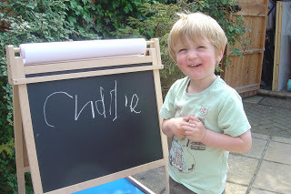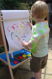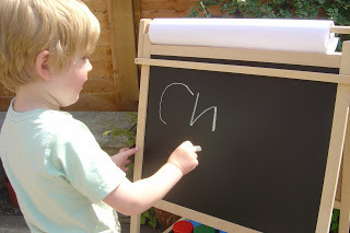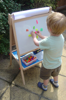 Having only just written about the world of electronic wizardry, today I'm turning back the clock to tell you about this: a wonderful site which promises hours of fun in the world of wooden toys. The people behind it were kind enough to send Charlie this wooden easel, and just look what he got up to: