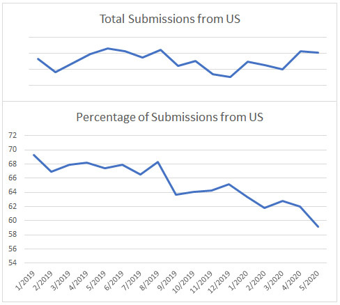 I’ve often said that the future of science fiction is international. It’s not a ding against US-based authors. We only represent 4.25% of the global population and the other 95.75% is getting more involved. Now I have some data to back that up. (CW submissions 1/2019-5/2020.)