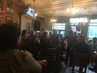 Too much excitement. A fabulous dinner in a UBC pub tonight with a group of fellow writers; we sat outside as far from the Raptors noise and excitement as we could - but by the last quarter, tied, we had to go in and watch. Excruciating, back and forth, so close, and at the last few seconds, they kept calling time out. The tension in the bar was thick. Judy Rebick, famous Canadian feminist activist and one of our presenters who'd had dinner with us was a few seats away, watching with bated breath.