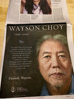 and my dear Wayson, in a notice taken out by his publisher that appeared on the weekend in the big daily papers. He'd have been tickled. "You're spoiling me," he used to say. "Don't stop." When I came in yesterday the light on my phone was blinking, a message for me; my heart stopped. The only person who left me messages, and many of them, was Wayson. But this was a welcome call from Anna who actually telephoned, a rare event for the texting generation. R.I.P.