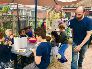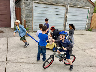 In fact, there were only about 20. That is, 20 kids around the age of seven, plus Ben at 3 who wants to be part of everything his big brother is part of. And with the miracle of my daughter's organization and Eli's dad Thomas's keeping an eye on things, much was the joy. They tore through the back yard and ended up in the laneway behind, rocketing up and down on bikes, skateboards, scooters, and a wagon, screaming with pleasure, while the parents sat with a beer in the yard and Anna prepared the usual mountain of food in the kitchen. It was the best yet, she said after, and I believe her.