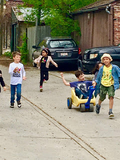 Looking out - the hot pink bleeding heart showering its delicate beauty, the mauve lilac, the shining white lilies of the valley and dogwood in full bloom, and mostly the million shades of green, the birds at the feeder, a few veggies planted, Wayson's gardenia in bud, getting ready to flower - and l am profoundly glad and grateful to live here still, in my own paradise. Yes, a paradise that is constantly disintegrating, time-consuming, enraging sometimes, but thanks to my little men, is standing. More than that, is beautiful. As the world gets uglier, incomprehensibly more filled with hatred - just read an article about the rise of the far-right worldwide - it's more important than ever to try to find and relish beauty and neighborhood and kindness. My daughter is spending today renting and driving a U-Haul to help a friend, a woman who left an abusive husband and spent 3 weeks living at Anna's with her son, to move. She puts her time where her heart is.