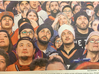The other day, as I rode the Dundas streetcar to Ryerson, there was a father with a little boy in a wheelchair. Two stops later, another family got on with an older boy in a power wheelchair. The first dad flipped up the side bank of seats to make a space for the new chair, and the dads chatted about Sick Kids - "What an awesome place," about their boys' surgeries there. Eventually, everyone around them was chatting and smiling. We're watching Toronto bond, too, over the Raptors - a fantastic picture in the Star of the crowd outside the arena last night, every colour under the sun.
