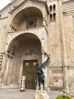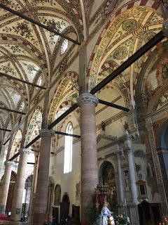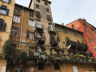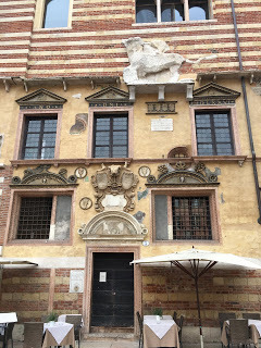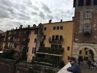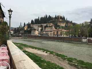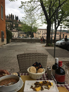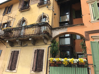 We did the Bruce Trail, as I call it, for he has been to the city several times and had our path mapped out. The Roman arena was closed, so we headed straight down the beautiful narrow streets to Juliet's balcony, obviously not hers but in a building owned since the 1200's by the family - But soft, what light through yonder window breaks? It is the east, and Juliet is the sun. Then for a cappucino on the market square, and then to a series of churches - he got us the church pass, five churches for the price of two, though we only made it to three - to see various treasures, including a famous altarpiece painting by Mantegna and a famous battered fresco by Pisanello. Lunch by the river, outside with an incredible view - polenta con funghi and minestrone, another fave - more walking and looking and admiring. I kept seeing tight groups of handsome, laughing young men or a pretty young girl and saying, There are the Montagues; there's Juliet Capulet.
