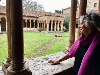 a medieval woman gazing at a medieval cloister.While I write this, Bruce is wrestling with the washing machine; we've put a load of laundry in - but where do you turn it on? Mystery; he's on the internet trying to figure it out. This morning I wrestled for ten minutes with the toaster, another medieval device, and the espresso pot, which took 15 minutes to heat up. Always with the adventures. Avanti!