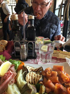 It's heading for 8 and we are home, tapping at our separate machines. Already, many beautiful memories of this trip, but several special ones from today - Bruce carefully applying the bandage, our lunch in a lovely piazza, our aperitivo. There's an art to successful restaurant finds in a strange city, and as Bruce says, you win some, you lose some. Today, winners all the way.