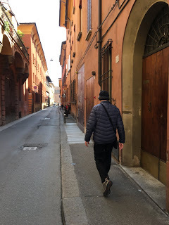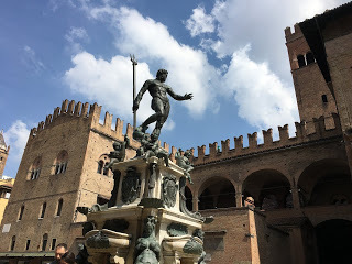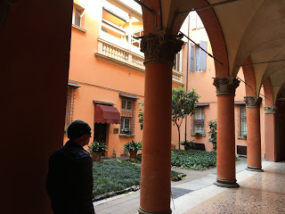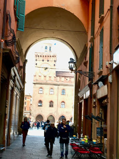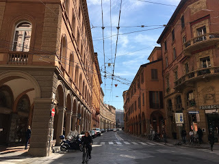 Thunderstorms predicted and instead, so far, at 5 p.m., a beautiful sunny day, the best of my time here so far. No trains today, just a leisurely stroll around town under the porticos; Bologna has 25 miles of arcaded streets - and, incidentally, many bike paths on the roads, well used. We saw - of course - churches and then the museum. Four churches, which made Bruce happy as he showed me the beauties therein, several enormous and baroque, others smaller, simpler, lovelier, one dedicated to Saint Cecilia, the patron saint of music, one with Roman remains and a cloister. Love cloisters. The streets packed, students shouting, eating, smoking, sitting on the medieval steps in the sun - do they even see the history and beauty that surrounds them as they go about their noisy teenaged lives?