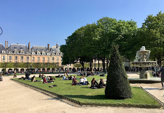 The Place des Vosges is a tradition with Lynn and me; she found this photo from 2014. My blue period. How warm it was in April that year, though the trees were not yet out!