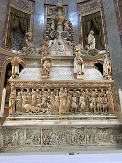 We only saw two churches, hooray. San Antonio - Saint Anthony - is adored here as the patron saint of lost things; I could use him at my place! These are his remains, bits of his body enclosed in gold; a group of small children was being led around. How creepy, I thought. I took this shot and received a reprimand from a priest. The cathedral, of course, is beyond enormous, loaded with marble, paintings, incredible painted vault ceiling, sculpture, gold leaf etc. Including a Donatello horse and rider outside.