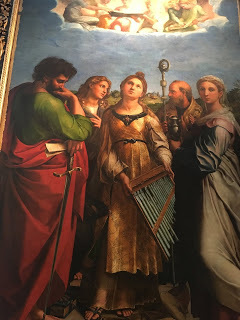 Raphael's Saint Ursula with her instruments and fellow saints - and Mary Magdelane - with angels reading music above