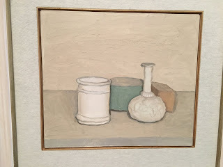 BK went home for a rest and I went to the museum of modern art to see one of my great favourites: Giorgio Morandi. Talk about a change from the Renaissance and the Baroque, the work of this extremely simple man, almost a hermit, who lived all his life in Bologna or the countryside nearby with his mother and three sisters, hardly travelled, painted what he saw, mostly the dusty vases and bottles in his atelier bedroom, and yet is considered the greatest Italian painter of the 20th century. I fell in love with Morandi years ago after seeing an exhibition at the Met in NYC. How can all those repeated shapes and forms mean so much? And yet they do. You feel his concentration go deeper and deeper into what it means to be alive and to see, to feel, to experience. His heroes were Piero della Francesca, Giotto - and Cezanne.