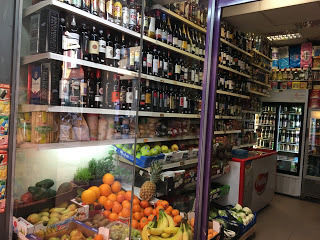 On the way home, passed this grocery store - selling, it seems, oranges, bananas, and wine.