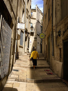 However, the flight left and landed on time and expelled its huge crowd of bleary Canadians into a gorgeous Parisian day. During the hundred mile hike to the other end of this vast airport to find my Air France flight to Montpellier, I slipped outside for a few minutes to turn my face to the sun like a starving plant. Everything is now automated in France, it seems; there was an issue with my suitcase, but luckily an actual French human being appeared to help me work things out. I found the next departure gate and had breakfast - a spinach and brie quiche which, though just in an airport dive, was absolutely delicious. And a yogurt "bio" in a glass jar. Bamboo cutlery.