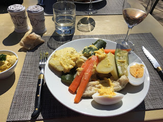 I had aioli - a dish of steamed vegetables and fish that you cover with a thick garlic mayonnaise. With the first rosé of the year. Divine. It could not have been nicer, the ambience, the food, everything. People kept arriving with their dogs and sitting outside - by the time we left, there were about 8 dogs. Ah, France.