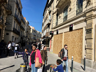 It's 7 and I can go down to breakfast. On the way here, Lynn showed me all the destruction caused by the gilets jaunes, who erupt in violence every Saturday and smash windows; banks, hotels, stores here in the town centre - all with boarded or broken windows. Montpellier is one of the hardest hit, so I'll be able to witness it tomorrow.