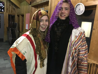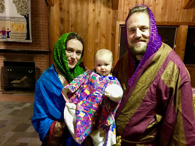 They're wearing sari silks I bought 20 years ago at Goodwill, plus a bathrobe for Joseph and a serape for the babe. Our budget for costumes was $0.00. And yet ...