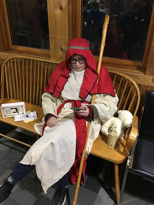 Here are some pictures of last night: a house just up the street, the young innkeeper (son of our usual innkeeper) and his wife (who I thought was his sister until I saw them kissing, and kissing some more), the shepherd checking her messages, the holy family of such extreme beauty, and the final tableau.
