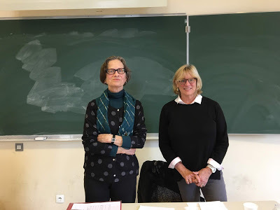 Had the unusual treat of checking my email at the intermission and finding a message from my best friend Lynn in France, a picture of her with her literary hero, the American uber short story writer Lydia Davis. Lynn, a linguist, has been parsing Lydia Davis's spare, enigmatic stories and at a conference got to meet her. Ironically, I had been thinking of my dear friend all day - at the book fair and especially at the show, because when we met in 1967, I was plugged into British bands and knew nothing about the American scene. Lynn introduced me to fabulous Motown, to Tammi Terrell and Marvin Gaye and the others. And for that, as well as much else, I will always be grateful. I was wishing she were there with me to see this finger-snapping show. And then there she was on my phone.
