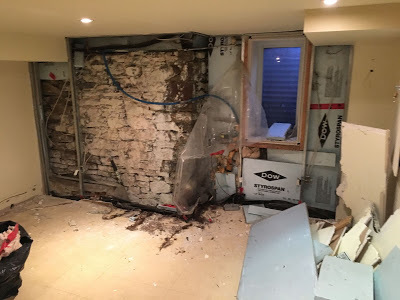 A blog-reader has written to ask me to post pictures of the renovation, so I will. Kevin and Ed ripped off the east wall of the basement, to find it rotted with water damage - a water pipe burst years ago, everything was damp, and the roots of the vast maple in my front yard had climbed right through the foundations into the baseboards. It was thrilling to touch the solid chunks of stone put in place in 1887, when this house was built. And it's thrilling to see it all insulated and dry and covered up. The whole eco-system down there has changed - including inviting the centipedes and daddy longlegs who made it their comfortable home for many years to move somewhere else.