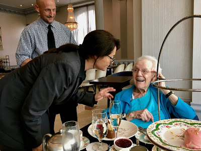 Today, excursions: to The Scottish and Irish Shop, jammed with British biscuits and sweets - Jaffa cakes, ginger nut biscuits, sultana biscuits and much more for Do. And to Ikea, because it's close and fun, to look at cool stuff and buy napkins and dish brushes. By then I expected Do to be exhausted, but no, she was up for high tea at the Chateau Laurier. I'd told them it was her 98th birthday, which was actually a month ago, and they brought a lit candle with a bit of cake.