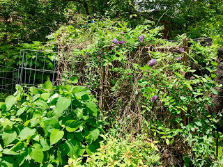 Today I walked into the garden, and there are purple wisteria blossoms on the fence. They're small, but they're there; it only took them 22 years to grow.