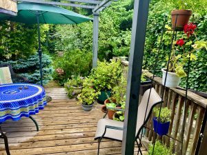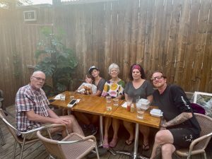 “At the start of my memoir-in-essays “Midlife Solo,” there’s an essay called “Announcement,” about the devastating moment my husband of ten years and I decided to end our marriage. And at the end of the book, “Coffeeshop Agreement” illuminates the moment we came to an understanding about contentious matters, fired our lawyers, and continued as co-parents and allies. Year by year, our friendship and mutual support have grown. I think of him as one of my dearest and wisest friends; we agree about so much. When he visits, staying here in what was our marital home, we talk endlessly about old friends and missing friends and family – our parents, his brothers. Our children, now nearly 40 and 43, come across town to their childhood home to be with both their parents. Decades later, this still astounds me.The love he and I have for each other is one of the greatest gifts of my life. At this dire time on our planet, every bit of kindness and forgiveness and love helps. So he and I are doing our bit.”As well as family duties, I was trying to keep up with the garden, watering, pruning, fertilizing the sprawling bean plants with nary a bean in sight, the constant battle with slugs. A keen student arrived from Edmonton to take the writing workshop and stayed here. The woman from whom we bought this house in 1986 dropped in for a visit. I went briefly to enjoy chic cocktails with my talented friend Alanna and her partner Myles in their artist loft-type space.