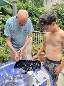 Two invitees had to cancel so there were ten of us, family and old friends. Matt, Ben’s dad, brought the boys from a weekend with him and stayed. It was wonderful. Sam came early to help cook; among other treats, he made grilled peaches on skewers with prosciutto and basil. We started on the deck and moved to the back forty for dinner. Much rosé was drunk. So much, in fact, I was woozy and off all day yesterday.